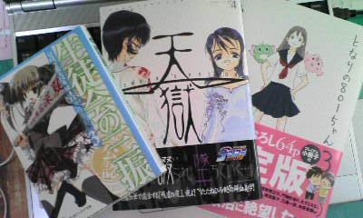 一昨日購入したのは『天獄』4巻と『となりの801ちゃん』3巻、昨日購入したのは『生徒会の三振』です。