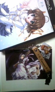 まず、D.C.P.Sは初回版の付属なしという形で¥1880で発見したので即決しました。ひだまりはまんだらけにて¥630にて全巻発見…もう少し安く手に入らないかと捜索していると3巻のみ¥315で発見しました。3巻のみ買うのもなんだかなぁだったので1,2巻は¥630、3巻は¥315で購入した。写真の掘り出し物らしきうぐぅストラップは只今改装工事中のためかゲマズにて発見(¥1000)、せっかくなのでリトバスのシールもらおうと(今ゲマズはkey商品¥2000分買うとリトバスのシールがもらえます)これまた掘り出し物らしきAIRのクリアファイル等4点のお買い上げで姉御のシールをいただきました。また、ゲマズにてBLACKLAGOON新刊を買ったので写真のポストカードと栞2枚GETです(今ゲマズで書籍なんでも1点ごとにリトバスの栞が(ry)。1枚はティアーズ・トゥ・ティアラなるものの栞でもう1枚は小毬MAX(ダブりorz)でした。他にもSNOWのD.G.PやxxxHOLICを古本で購入したため極度の金欠状態にあります;; (試験終わったらバイトしよぉ…)